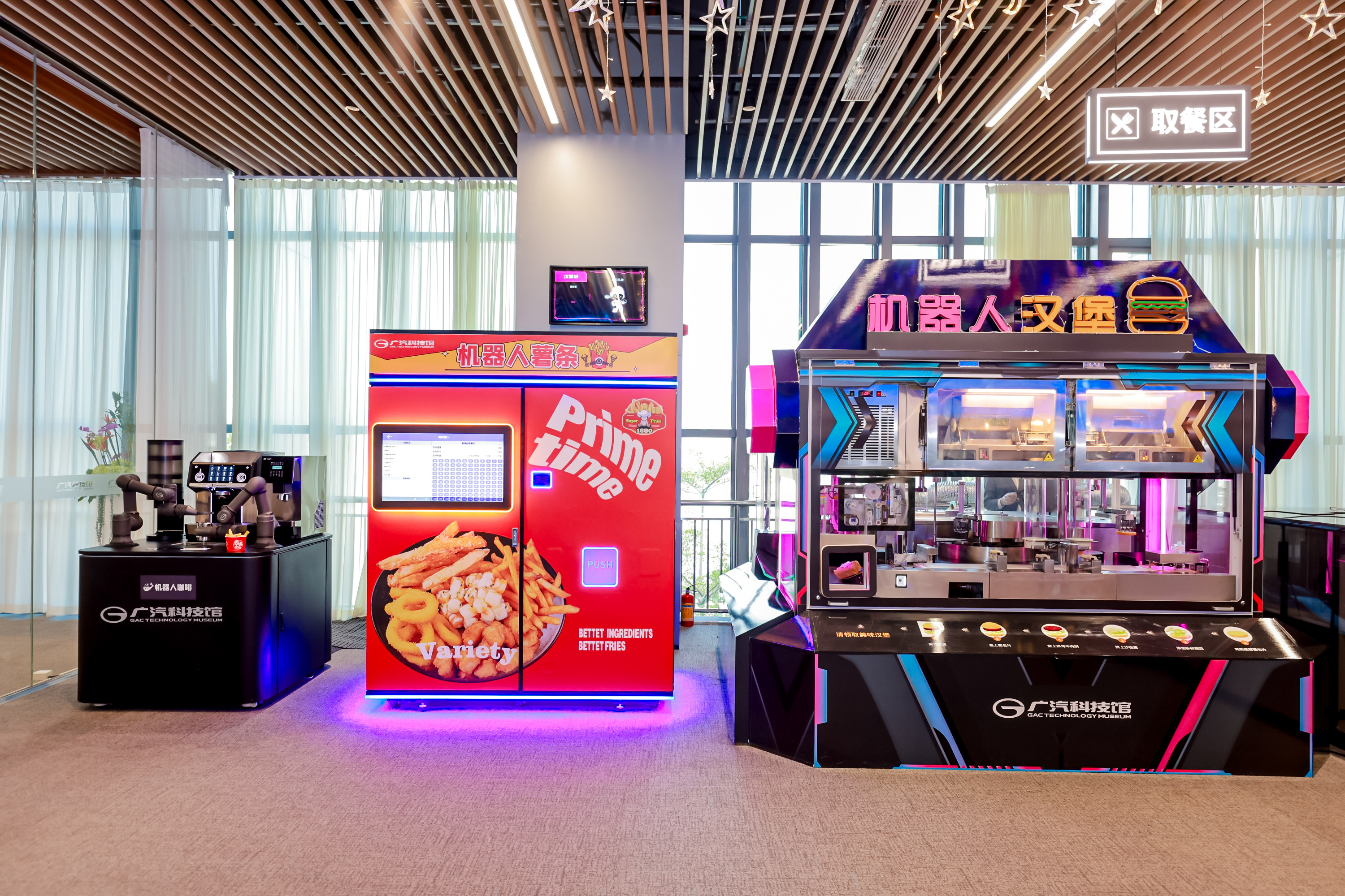作为广州“智车之城”及“科技广汽”的创新窗口,广汽科技馆于2023年3月正式开馆,超级体验中心于2023年11月开业,集产品展示中心、顾客体验中心、销售服务中心于一体的“三个中心”职能全面落地。在此基础上,与智能、前沿、绿色的基因一脉相承,位于广汽科技馆二楼的机器人餐厅也在活动当天正式开业。该餐厅主要由机器人提供服务,有“汉堡机器人”、“薯条机器人”、“咖啡机器人”以及“送餐机器人”。通过实现餐饮制作过程全自动化,为消费者带来与众不同的科技服务和充满未来科技感的就餐体验。