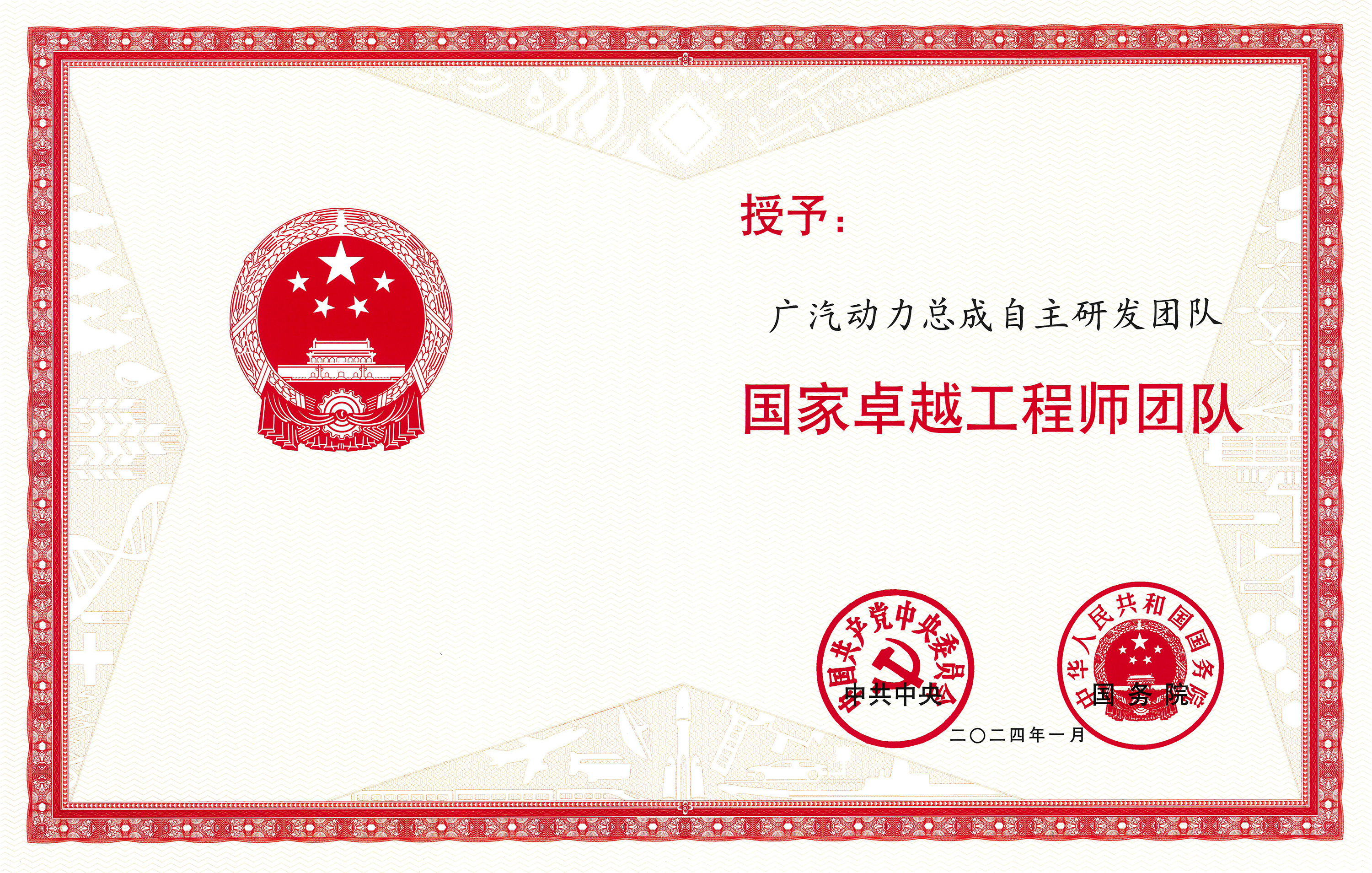 1月19日,“国家工程师奖”表彰大会在北京人民大会堂隆重举行,81名个人被授予“国家卓越工程师”称号,50个团队被授予“国家卓越工程师团队”称号。广汽动力总成自主研发团队荣获“国家卓越工程师团队”称号。